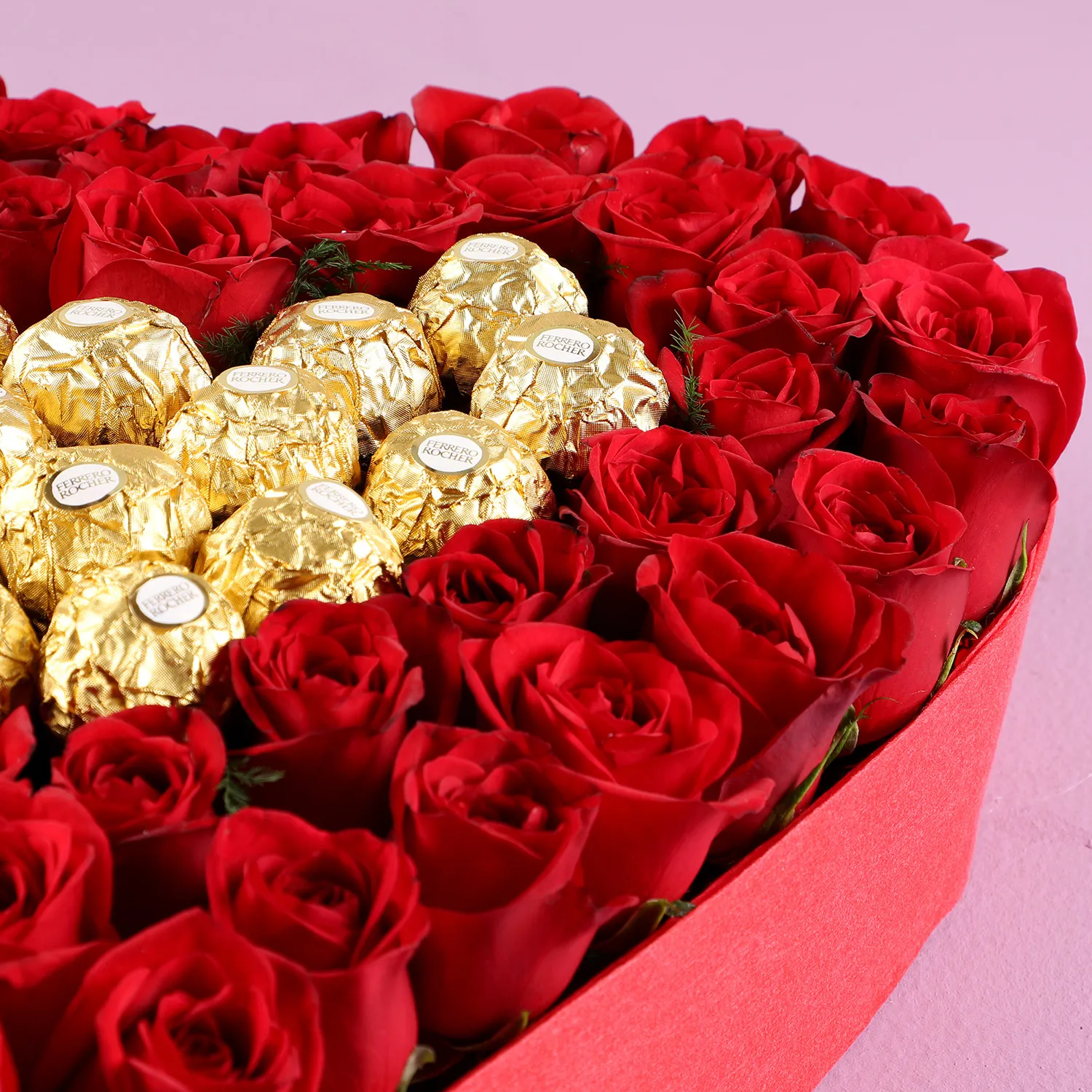 Express your deepest emotions with this stunning Scarlet Heart Luxury Arrangement, designed to captivate and impress. Featuring luxurious red roses carefully arranged in a beautiful heart-shaped box, this elegant creation symbolizes everlasting love and passion. At the center, premium chocolates add a sweet surprise, making it the perfect combination of romance and indulgence. Ideal for Valentine’s Day, anniversaries, proposals, or unforgettable romantic gestures, this arrangement creates a breathtaking presentation that speaks straight to the heart. Sophisticated, meaningful, and beautifully crafted, it’s a timeless gift that turns special moments into cherished memories filled with love and sweetness.